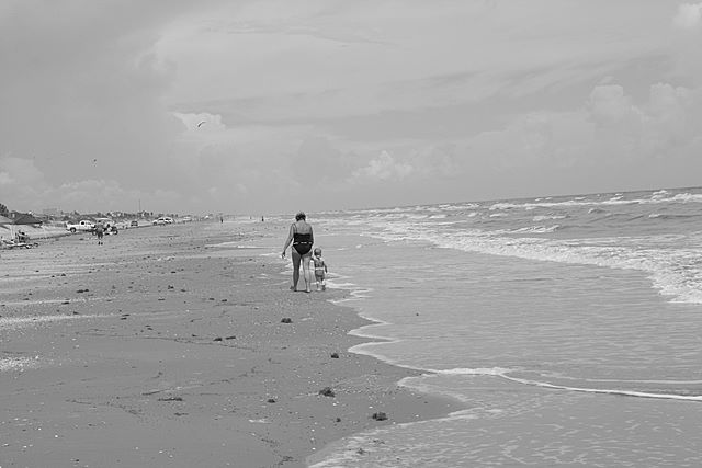 2008-08-04 Beach -- Patti and Averi going to check out the kites