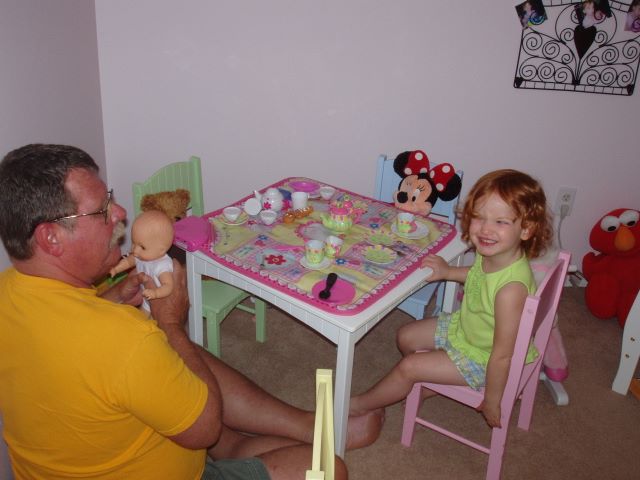 2007-07-01 Kids -- Grandaddy playing tea party with Sydni