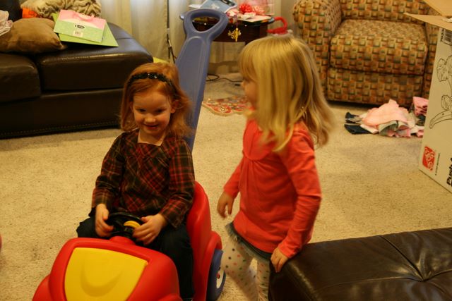 2008-01-12 Reaghan's 1st bday -- The girls trying out Reaghan's new ride