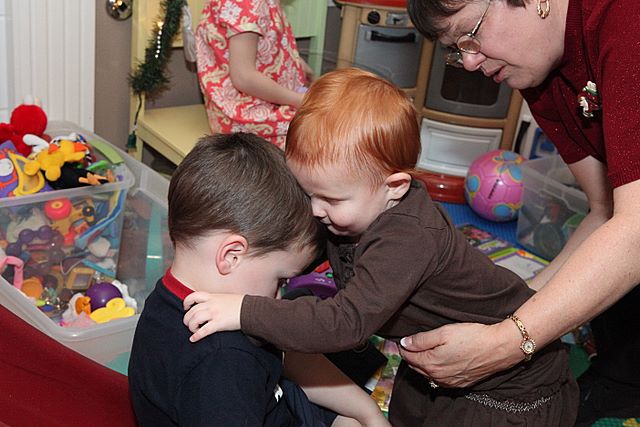 2008-12-13 Syd's 4th party -- Averi giving Russell a hug